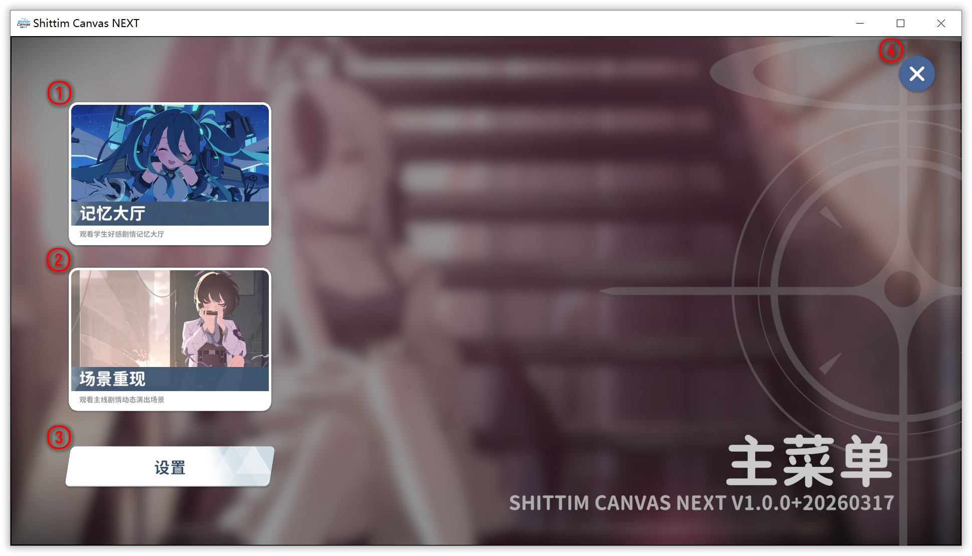 功能总览主菜单版本:Next主菜单 查看我们高技术力带模糊背景的主菜单的功能 图示功能①记忆大厅角色按钮 进入记忆大厅角色模式。②剧情动态背景按钮 进入场景重现模式。③设置按钮 打开设置窗口。④关闭页面按钮 隐藏主菜单页面。